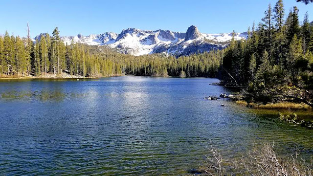 After a couple of days and a bit of a sunburn, I made my way east and then south, around the Sierra Nevada mountains. After a couple of hours, I was getting restless and decided to take the first right hand turn into the mountains that came along. It was a good choice. I followed a dirt road for several miles, traversing the side of a snow-capped mountain across fields of flowers and brush into trees, across creeks and hot springs (it was about 95 degrees or I would have stopped), through old mill grounds, and eventually found my way to the back side of Mammoth Lakes.