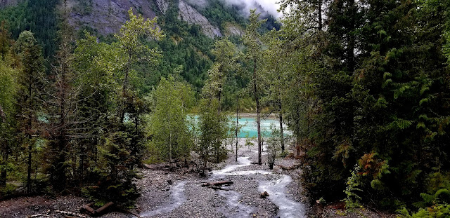 The trail was super diverse, starting out in a lush forest with wildflowers as tall as me, huge ferns, and lots of moss. There wasn't anybody around it was so quiet with the exception of the rain, it was really peaceful and beautiful and kind of eerie and I was just waiting for a Grizzly to pop out of the mist and eat my face off. I followed the Robson River on a wide, relatively flat pathway for a couple of miles to the shore of Kinney Lake. The rain had flooded out much of the trail along the lake, so I was thankful to have my Chaco's on, but before long, I was starting to rub spots on the insides of my heels...lots of mud and pine needles and dirt and glacial sediment rubbing into my damp skin for miles and miles. I debated stopping to put on my socks, but with so many stream crossings and puddles, I didn't see much of a point.